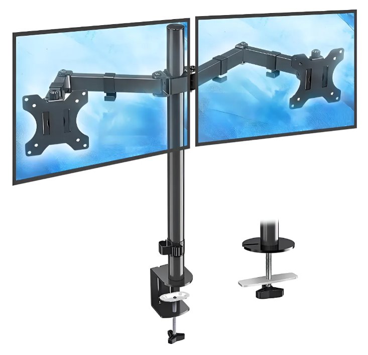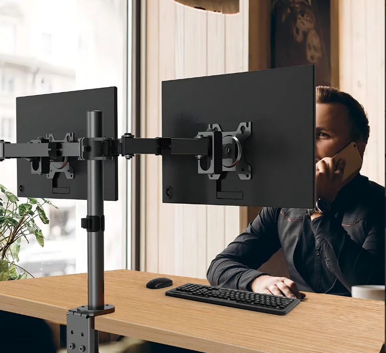 El soporte de escritorio 2 brazos para monitor es perfecto para aquellos que desean maximizar su espacio de trabajo y tener una visualización óptima de sus pantallas. Este soporte está diseñado para monitores de 10" a 27" y cuenta con dos brazos ajustables que permiten una rotación de 180° y una rotación completa de 360°, lo que le brinda la flexibilidad de ajustar la posición de sus pantallas según sus necesidades.